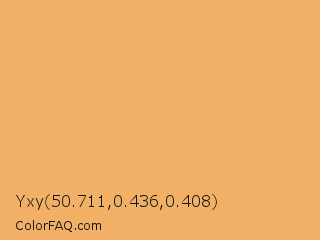 Yxy 50.711,0.436,0.408 Color is a light orange color and the nearest color is Porsche #eaae69. Hex code #f1b066 and RGB value is rgb(241,176,102). In RGB color space, this color is composed of 95% red, 69% green, 40% blue, In CMYK color space, this color is composed of 0% cyan, 27% magenta, 58% yellow , 5% black , In HSL color space, this color has a hue angle of 32° , 83% saturation and 67% lightness.