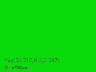 Yxy 50.717,0.3,0.597 Color is a normal green color and the nearest color is Green #00ff00. Hex code #09db0b and RGB value is rgb(9,219,11). In RGB color space, this color is composed of 4% red, 86% green, 4% blue, In CMYK color space, this color is composed of 96% cyan, 0% magenta, 95% yellow , 14% black , In HSL color space, this color has a hue angle of 121° , 92% saturation and 45% lightness.