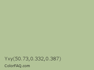 Yxy 50.73,0.332,0.387 Color is a light green color and the nearest color is Laurel Green #a9ba9d. Hex code #b2c397 and RGB value is rgb(178,195,151). In RGB color space, this color is composed of 70% red, 76% green, 59% blue, In CMYK color space, this color is composed of 9% cyan, 0% magenta, 23% yellow , 24% black , In HSL color space, this color has a hue angle of 83° , 27% saturation and 68% lightness.