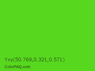 Yxy 50.769,0.321,0.571 Color is a normal green color and the nearest color is Harlequin Green #46cb18. Hex code #58d71f and RGB value is rgb(88,215,31). In RGB color space, this color is composed of 35% red, 84% green, 12% blue, In CMYK color space, this color is composed of 59% cyan, 0% magenta, 86% yellow , 16% black , In HSL color space, this color has a hue angle of 101° , 75% saturation and 48% lightness.