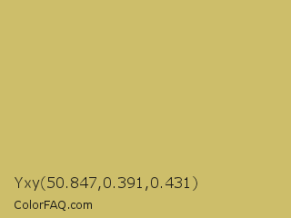 Yxy 50.847,0.391,0.431 Color is a light yellow color and the nearest color is Laser #c8b568. Hex code #cdbe6a and RGB value is rgb(205,190,106). In RGB color space, this color is composed of 80% red, 75% green, 42% blue, In CMYK color space, this color is composed of 0% cyan, 7% magenta, 48% yellow , 20% black , In HSL color space, this color has a hue angle of 51° , 50% saturation and 61% lightness.