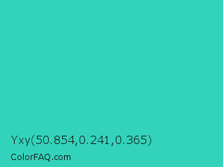 Yxy 50.854,0.241,0.365 Color is a normal cyan color and the nearest color is Turquoise PWG #30d5c8. Hex code #33d3bb and RGB value is rgb(51,211,187). In RGB color space, this color is composed of 20% red, 83% green, 73% blue, In CMYK color space, this color is composed of 76% cyan, 0% magenta, 11% yellow , 17% black , In HSL color space, this color has a hue angle of 171° , 65% saturation and 51% lightness.