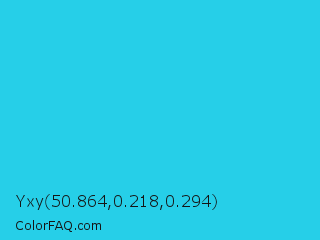 Yxy 50.864,0.218,0.294 Color is a normal cyan color and the nearest color is Scooter #2ebfd4. Hex code #26cfe8 and RGB value is rgb(38,207,232). In RGB color space, this color is composed of 15% red, 81% green, 91% blue, In CMYK color space, this color is composed of 84% cyan, 11% magenta, 0% yellow , 9% black , In HSL color space, this color has a hue angle of 188° , 81% saturation and 53% lightness.