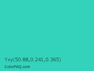 Yxy 50.88,0.241,0.365 Color is a normal cyan color and the nearest color is Turquoise PWG #30d5c8. Hex code #33d3bb and RGB value is rgb(51,211,187). In RGB color space, this color is composed of 20% red, 83% green, 73% blue, In CMYK color space, this color is composed of 76% cyan, 0% magenta, 11% yellow , 17% black , In HSL color space, this color has a hue angle of 171° , 65% saturation and 51% lightness.