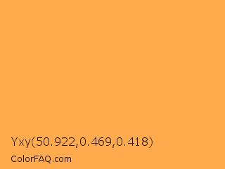Yxy 50.922,0.469,0.418 Color is a light orange color and the nearest color is Pastel Orange #ffb347. Hex code #ffab4d and RGB value is rgb(255,171,77). In RGB color space, this color is composed of 100% red, 67% green, 30% blue, In CMYK color space, this color is composed of 0% cyan, 33% magenta, 70% yellow , 0% black , In HSL color space, this color has a hue angle of 32° , 100% saturation and 65% lightness.