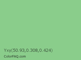 Yxy 50.93,0.308,0.424 Color is a light green color and the nearest color is Dark Sea Green #8fbc8f. Hex code #8acd8b and RGB value is rgb(138,205,139). In RGB color space, this color is composed of 54% red, 80% green, 55% blue, In CMYK color space, this color is composed of 33% cyan, 0% magenta, 32% yellow , 20% black , In HSL color space, this color has a hue angle of 121° , 40% saturation and 67% lightness.