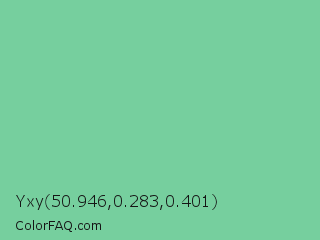 Yxy 50.946,0.283,0.401 Color is a light green color and the nearest color is Medium Aquamarine #66ddaa. Hex code #76cf9e and RGB value is rgb(118,207,158). In RGB color space, this color is composed of 46% red, 81% green, 62% blue, In CMYK color space, this color is composed of 43% cyan, 0% magenta, 24% yellow , 19% black , In HSL color space, this color has a hue angle of 147° , 48% saturation and 64% lightness.