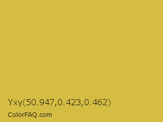 Yxy 50.947,0.423,0.462 Color is a normal yellow color and the nearest color is Turmeric #cabb48. Hex code #d5bd43 and RGB value is rgb(213,189,67). In RGB color space, this color is composed of 84% red, 74% green, 26% blue, In CMYK color space, this color is composed of 0% cyan, 11% magenta, 69% yellow , 16% black , In HSL color space, this color has a hue angle of 50° , 63% saturation and 55% lightness.