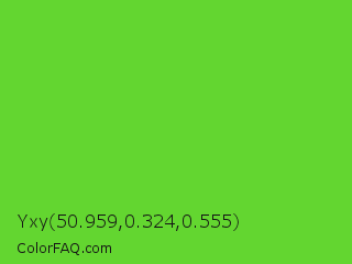 Yxy 50.959,0.324,0.555 Color is a normal green color and the nearest color is Green RYB #66b032. Hex code #63d630 and RGB value is rgb(99,214,48). In RGB color space, this color is composed of 39% red, 84% green, 19% blue, In CMYK color space, this color is composed of 54% cyan, 0% magenta, 78% yellow , 16% black , In HSL color space, this color has a hue angle of 102° , 67% saturation and 51% lightness.