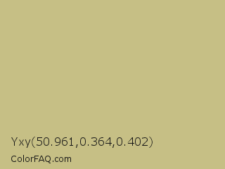 Yxy 50.961,0.364,0.402 Color is a light yellow color and the nearest color is Sage #bcb88a. Hex code #c6bf85 and RGB value is rgb(198,191,133). In RGB color space, this color is composed of 78% red, 75% green, 52% blue, In CMYK color space, this color is composed of 0% cyan, 4% magenta, 33% yellow , 22% black , In HSL color space, this color has a hue angle of 54° , 36% saturation and 65% lightness.