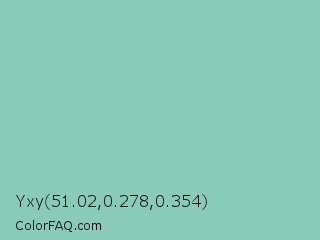 Yxy 51.02,0.278,0.354 Color is a light green color and the nearest color is Vista Blue #8fd6b4. Hex code #89cab8 and RGB value is rgb(137,202,184). In RGB color space, this color is composed of 54% red, 79% green, 72% blue, In CMYK color space, this color is composed of 32% cyan, 0% magenta, 9% yellow , 21% black , In HSL color space, this color has a hue angle of 163° , 38% saturation and 66% lightness.