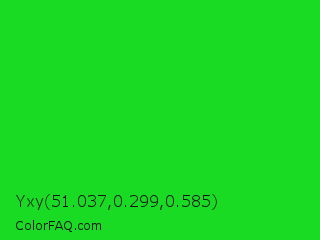 Yxy 51.037,0.299,0.585 Color is a normal green color and the nearest color is Lime Green #32cd32. Hex code #1adb24 and RGB value is rgb(26,219,36). In RGB color space, this color is composed of 10% red, 86% green, 14% blue, In CMYK color space, this color is composed of 88% cyan, 0% magenta, 84% yellow , 14% black , In HSL color space, this color has a hue angle of 123° , 79% saturation and 48% lightness.