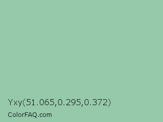 Yxy 51.065,0.295,0.372 Color is a light green color and the nearest color is Eton Blue #96c8a2. Hex code #95c9aa and RGB value is rgb(149,201,170). In RGB color space, this color is composed of 58% red, 79% green, 67% blue, In CMYK color space, this color is composed of 26% cyan, 0% magenta, 15% yellow , 21% black , In HSL color space, this color has a hue angle of 144° , 33% saturation and 69% lightness.