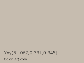 Yxy 51.067,0.331,0.345 Color is a light orange color and the nearest color is Tea #c1bab0. Hex code #c6bcaf and RGB value is rgb(198,188,175). In RGB color space, this color is composed of 78% red, 74% green, 69% blue, In CMYK color space, this color is composed of 0% cyan, 5% magenta, 12% yellow , 22% black , In HSL color space, this color has a hue angle of 34° , 17% saturation and 73% lightness.