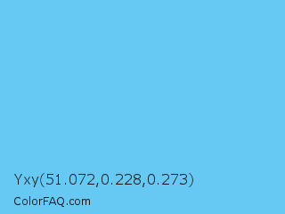 Yxy 51.072,0.228,0.273 Color is a light blue color and the nearest color is Maya Blue #73c2fb. Hex code #66c9f4 and RGB value is rgb(102,201,244). In RGB color space, this color is composed of 40% red, 79% green, 96% blue, In CMYK color space, this color is composed of 58% cyan, 18% magenta, 0% yellow , 4% black , In HSL color space, this color has a hue angle of 198° , 87% saturation and 68% lightness.