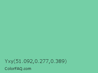 Yxy 51.092,0.277,0.389 Color is a light green color and the nearest color is Medium Aquamarine #66ddaa. Hex code #74cfa6 and RGB value is rgb(116,207,166). In RGB color space, this color is composed of 45% red, 81% green, 65% blue, In CMYK color space, this color is composed of 44% cyan, 0% magenta, 20% yellow , 19% black , In HSL color space, this color has a hue angle of 153° , 49% saturation and 63% lightness.