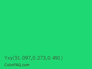 Yxy 51.097,0.273,0.491 Color is a normal green color and the nearest color is UFO Green #3cd070. Hex code #1ed973 and RGB value is rgb(30,217,115). In RGB color space, this color is composed of 12% red, 85% green, 45% blue, In CMYK color space, this color is composed of 86% cyan, 0% magenta, 47% yellow , 15% black , In HSL color space, this color has a hue angle of 147° , 76% saturation and 48% lightness.