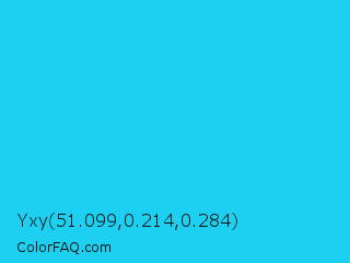 Yxy 51.099,0.214,0.284 Color is a normal cyan color and the nearest color is Spiro Disco Ball #0fc0fc. Hex code #1dcff0 and RGB value is rgb(29,207,240). In RGB color space, this color is composed of 11% red, 81% green, 94% blue, In CMYK color space, this color is composed of 88% cyan, 14% magenta, 0% yellow , 6% black , In HSL color space, this color has a hue angle of 189° , 88% saturation and 53% lightness.