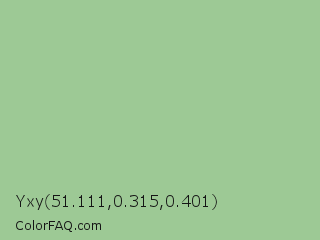 Yxy 51.111,0.315,0.401 Color is a light green color and the nearest color is Eton Blue #96c8a2. Hex code #9dc995 and RGB value is rgb(157,201,149). In RGB color space, this color is composed of 62% red, 79% green, 58% blue, In CMYK color space, this color is composed of 22% cyan, 0% magenta, 26% yellow , 21% black , In HSL color space, this color has a hue angle of 111° , 33% saturation and 69% lightness.