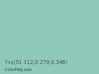 Yxy 51.112,0.279,0.348 Color is a light cyan color and the nearest color is Shadow Green #9ac2b8. Hex code #8ec9bb and RGB value is rgb(142,201,187). In RGB color space, this color is composed of 56% red, 79% green, 73% blue, In CMYK color space, this color is composed of 29% cyan, 0% magenta, 7% yellow , 21% black , In HSL color space, this color has a hue angle of 166° , 35% saturation and 67% lightness.