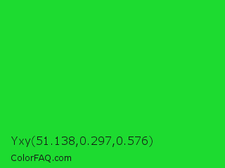 Yxy 51.138,0.297,0.576 Color is a normal green color and the nearest color is Lime Green #32cd32. Hex code #1ddb30 and RGB value is rgb(29,219,48). In RGB color space, this color is composed of 11% red, 86% green, 19% blue, In CMYK color space, this color is composed of 87% cyan, 0% magenta, 78% yellow , 14% black , In HSL color space, this color has a hue angle of 126° , 77% saturation and 49% lightness.