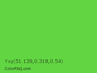 Yxy 51.139,0.318,0.54 Color is a normal green color and the nearest color is Green RYB #66b032. Hex code #62d642 and RGB value is rgb(98,214,66). In RGB color space, this color is composed of 38% red, 84% green, 26% blue, In CMYK color space, this color is composed of 54% cyan, 0% magenta, 69% yellow , 16% black , In HSL color space, this color has a hue angle of 107° , 64% saturation and 55% lightness.