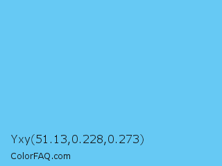 Yxy 51.13,0.228,0.273 Color is a light blue color and the nearest color is Maya Blue #73c2fb. Hex code #66c9f4 and RGB value is rgb(102,201,244). In RGB color space, this color is composed of 40% red, 79% green, 96% blue, In CMYK color space, this color is composed of 58% cyan, 18% magenta, 0% yellow , 4% black , In HSL color space, this color has a hue angle of 198° , 87% saturation and 68% lightness.