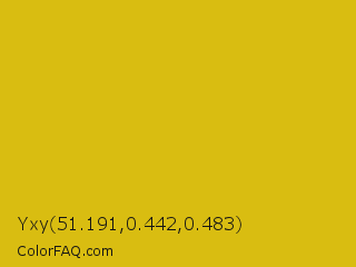 Yxy 51.191,0.442,0.483 Color is a normal yellow color and the nearest color is Gold Tips #deba13. Hex code #d9bd11 and RGB value is rgb(217,189,17). In RGB color space, this color is composed of 85% red, 74% green, 7% blue, In CMYK color space, this color is composed of 0% cyan, 13% magenta, 92% yellow , 15% black , In HSL color space, this color has a hue angle of 52° , 85% saturation and 46% lightness.