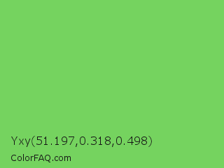 Yxy 51.197,0.318,0.498 Color is a normal green color and the nearest color is Mantis #74c365. Hex code #75d35f and RGB value is rgb(117,211,95). In RGB color space, this color is composed of 46% red, 83% green, 37% blue, In CMYK color space, this color is composed of 45% cyan, 0% magenta, 55% yellow , 17% black , In HSL color space, this color has a hue angle of 109° , 57% saturation and 60% lightness.