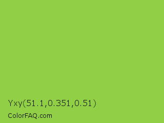 Yxy 51.1,0.351,0.51 Color is a normal green color and the nearest color is Yellow Green #9acd32. Hex code #91cf47 and RGB value is rgb(145,207,71). In RGB color space, this color is composed of 57% red, 81% green, 28% blue, In CMYK color space, this color is composed of 30% cyan, 0% magenta, 66% yellow , 19% black , In HSL color space, this color has a hue angle of 87° , 59% saturation and 55% lightness.