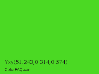 Yxy 51.243,0.314,0.574 Color is a normal green color and the nearest color is Harlequin Green #46cb18. Hex code #4bd923 and RGB value is rgb(75,217,35). In RGB color space, this color is composed of 29% red, 85% green, 14% blue, In CMYK color space, this color is composed of 65% cyan, 0% magenta, 84% yellow , 15% black , In HSL color space, this color has a hue angle of 107° , 72% saturation and 49% lightness.