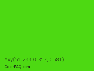 Yxy 51.244,0.317,0.581 Color is a normal green color and the nearest color is Harlequin Green #46cb18. Hex code #4dd912 and RGB value is rgb(77,217,18). In RGB color space, this color is composed of 30% red, 85% green, 7% blue, In CMYK color space, this color is composed of 65% cyan, 0% magenta, 92% yellow , 15% black , In HSL color space, this color has a hue angle of 102° , 85% saturation and 46% lightness.
