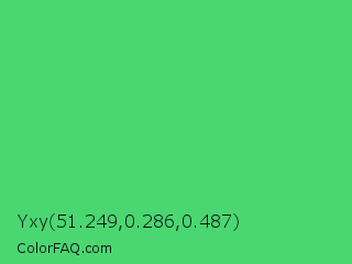 Yxy 51.249,0.286,0.487 Color is a normal green color and the nearest color is UFO Green #3cd070. Hex code #4ad771 and RGB value is rgb(74,215,113). In RGB color space, this color is composed of 29% red, 84% green, 44% blue, In CMYK color space, this color is composed of 66% cyan, 0% magenta, 47% yellow , 16% black , In HSL color space, this color has a hue angle of 137° , 64% saturation and 57% lightness.