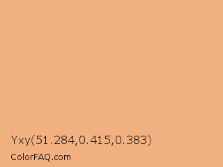 Yxy 51.284,0.415,0.383 Color is a light orange color and the nearest color is Tacao #edb381. Hex code #f1b07f and RGB value is rgb(241,176,127). In RGB color space, this color is composed of 95% red, 69% green, 50% blue, In CMYK color space, this color is composed of 0% cyan, 27% magenta, 47% yellow , 5% black , In HSL color space, this color has a hue angle of 26° , 80% saturation and 72% lightness.