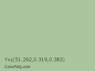Yxy 51.292,0.319,0.383 Color is a light green color and the nearest color is Norway #a8bd9f. Hex code #a9c69e and RGB value is rgb(169,198,158). In RGB color space, this color is composed of 66% red, 78% green, 62% blue, In CMYK color space, this color is composed of 15% cyan, 0% magenta, 20% yellow , 22% black , In HSL color space, this color has a hue angle of 104° , 26% saturation and 70% lightness.