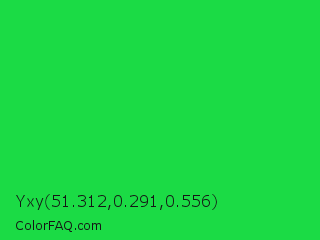 Yxy 51.312,0.291,0.556 Color is a normal green color and the nearest color is Malachite #0bda51. Hex code #1bdb45 and RGB value is rgb(27,219,69). In RGB color space, this color is composed of 11% red, 86% green, 27% blue, In CMYK color space, this color is composed of 88% cyan, 0% magenta, 68% yellow , 14% black , In HSL color space, this color has a hue angle of 133° , 78% saturation and 48% lightness.