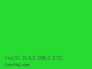 Yxy 51.314,0.298,0.572 Color is a normal green color and the nearest color is Lime Green #32cd32. Hex code #26db33 and RGB value is rgb(38,219,51). In RGB color space, this color is composed of 15% red, 86% green, 20% blue, In CMYK color space, this color is composed of 83% cyan, 0% magenta, 77% yellow , 14% black , In HSL color space, this color has a hue angle of 124° , 72% saturation and 50% lightness.