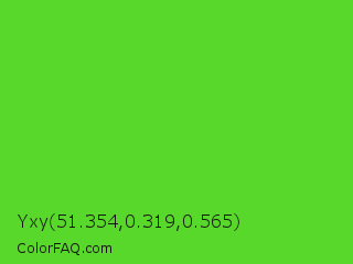 Yxy 51.354,0.319,0.565 Color is a normal green color and the nearest color is Harlequin Green #46cb18. Hex code #58d82a and RGB value is rgb(88,216,42). In RGB color space, this color is composed of 35% red, 85% green, 16% blue, In CMYK color space, this color is composed of 59% cyan, 0% magenta, 81% yellow , 15% black , In HSL color space, this color has a hue angle of 104° , 69% saturation and 51% lightness.