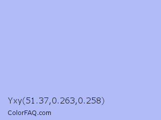 Yxy 51.37,0.263,0.258 Color is a very light blue color and the nearest color is Perano #a9bef2. Hex code #b0bbf7 and RGB value is rgb(176,187,247). In RGB color space, this color is composed of 69% red, 73% green, 97% blue, In CMYK color space, this color is composed of 29% cyan, 24% magenta, 0% yellow , 3% black , In HSL color space, this color has a hue angle of 231° , 82% saturation and 83% lightness.
