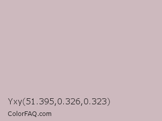Yxy 51.395,0.326,0.323 Color is a light red color and the nearest color is Cold Turkey #cebaba. Hex code #cdb9be and RGB value is rgb(205,185,190). In RGB color space, this color is composed of 80% red, 73% green, 75% blue, In CMYK color space, this color is composed of 0% cyan, 10% magenta, 7% yellow , 20% black , In HSL color space, this color has a hue angle of 345° , 17% saturation and 76% lightness.