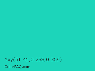 Yxy 51.41,0.238,0.369 Color is a normal cyan color and the nearest color is Java #1fc2c2. Hex code #1cd5ba and RGB value is rgb(28,213,186). In RGB color space, this color is composed of 11% red, 84% green, 73% blue, In CMYK color space, this color is composed of 87% cyan, 0% magenta, 13% yellow , 16% black , In HSL color space, this color has a hue angle of 171° , 77% saturation and 47% lightness.