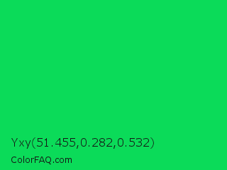 Yxy 51.455,0.282,0.532 Color is a normal green color and the nearest color is Malachite #0bda51. Hex code #0bdb59 and RGB value is rgb(11,219,89). In RGB color space, this color is composed of 4% red, 86% green, 35% blue, In CMYK color space, this color is composed of 95% cyan, 0% magenta, 59% yellow , 14% black , In HSL color space, this color has a hue angle of 143° , 90% saturation and 45% lightness.