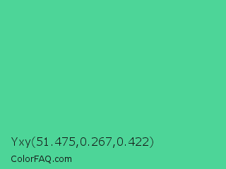 Yxy 51.475,0.267,0.422 Color is a normal green color and the nearest color is Eucalyptus #44d7a8. Hex code #4dd598 and RGB value is rgb(77,213,152). In RGB color space, this color is composed of 30% red, 84% green, 60% blue, In CMYK color space, this color is composed of 64% cyan, 0% magenta, 29% yellow , 16% black , In HSL color space, this color has a hue angle of 153° , 62% saturation and 57% lightness.