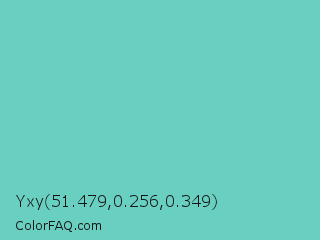 Yxy 51.479,0.256,0.349 Color is a light cyan color and the nearest color is Downy #6fd0c5. Hex code #69cfc1 and RGB value is rgb(105,207,193). In RGB color space, this color is composed of 41% red, 81% green, 76% blue, In CMYK color space, this color is composed of 49% cyan, 0% magenta, 7% yellow , 19% black , In HSL color space, this color has a hue angle of 172° , 52% saturation and 61% lightness.