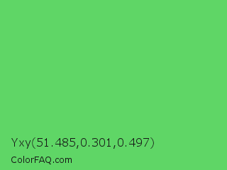 Yxy 51.485,0.301,0.497 Color is a light green color and the nearest color is Emerald #50c878. Hex code #5fd666 and RGB value is rgb(95,214,102). In RGB color space, this color is composed of 37% red, 84% green, 40% blue, In CMYK color space, this color is composed of 56% cyan, 0% magenta, 52% yellow , 16% black , In HSL color space, this color has a hue angle of 124° , 59% saturation and 61% lightness.