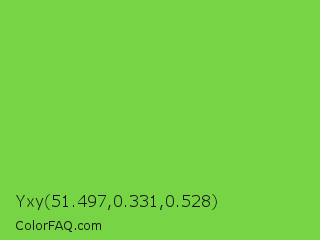 Yxy 51.497,0.331,0.528 Color is a normal green color and the nearest color is Kiwi #8ee53f. Hex code #77d444 and RGB value is rgb(119,212,68). In RGB color space, this color is composed of 47% red, 83% green, 27% blue, In CMYK color space, this color is composed of 44% cyan, 0% magenta, 68% yellow , 17% black , In HSL color space, this color has a hue angle of 99° , 63% saturation and 55% lightness.