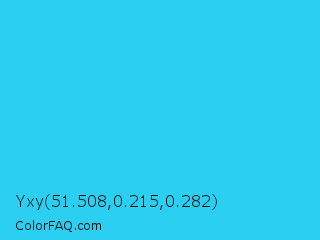 Yxy 51.508,0.215,0.282 Color is a normal cyan color and the nearest color is Spiro Disco Ball #0fc0fc. Hex code #2acff2 and RGB value is rgb(42,207,242). In RGB color space, this color is composed of 16% red, 81% green, 95% blue, In CMYK color space, this color is composed of 83% cyan, 14% magenta, 0% yellow , 5% black , In HSL color space, this color has a hue angle of 191° , 88% saturation and 56% lightness.
