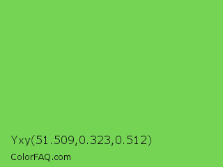 Yxy 51.509,0.323,0.512 Color is a normal green color and the nearest color is Mantis #74c365. Hex code #75d454 and RGB value is rgb(117,212,84). In RGB color space, this color is composed of 46% red, 83% green, 33% blue, In CMYK color space, this color is composed of 45% cyan, 0% magenta, 60% yellow , 17% black , In HSL color space, this color has a hue angle of 105° , 60% saturation and 58% lightness.