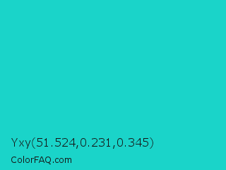 Yxy 51.524,0.231,0.345 Color is a normal cyan color and the nearest color is Java #1fc2c2. Hex code #1ad4c9 and RGB value is rgb(26,212,201). In RGB color space, this color is composed of 10% red, 83% green, 79% blue, In CMYK color space, this color is composed of 88% cyan, 0% magenta, 5% yellow , 17% black , In HSL color space, this color has a hue angle of 176° , 78% saturation and 47% lightness.