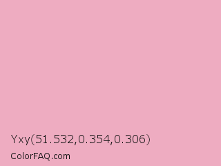 Yxy 51.532,0.354,0.306 Color is a light rose color and the nearest color is Nadeshiko Pink #f6adc6. Hex code #eeacc1 and RGB value is rgb(238,172,193). In RGB color space, this color is composed of 93% red, 67% green, 76% blue, In CMYK color space, this color is composed of 0% cyan, 28% magenta, 19% yellow , 7% black , In HSL color space, this color has a hue angle of 341° , 66% saturation and 80% lightness.